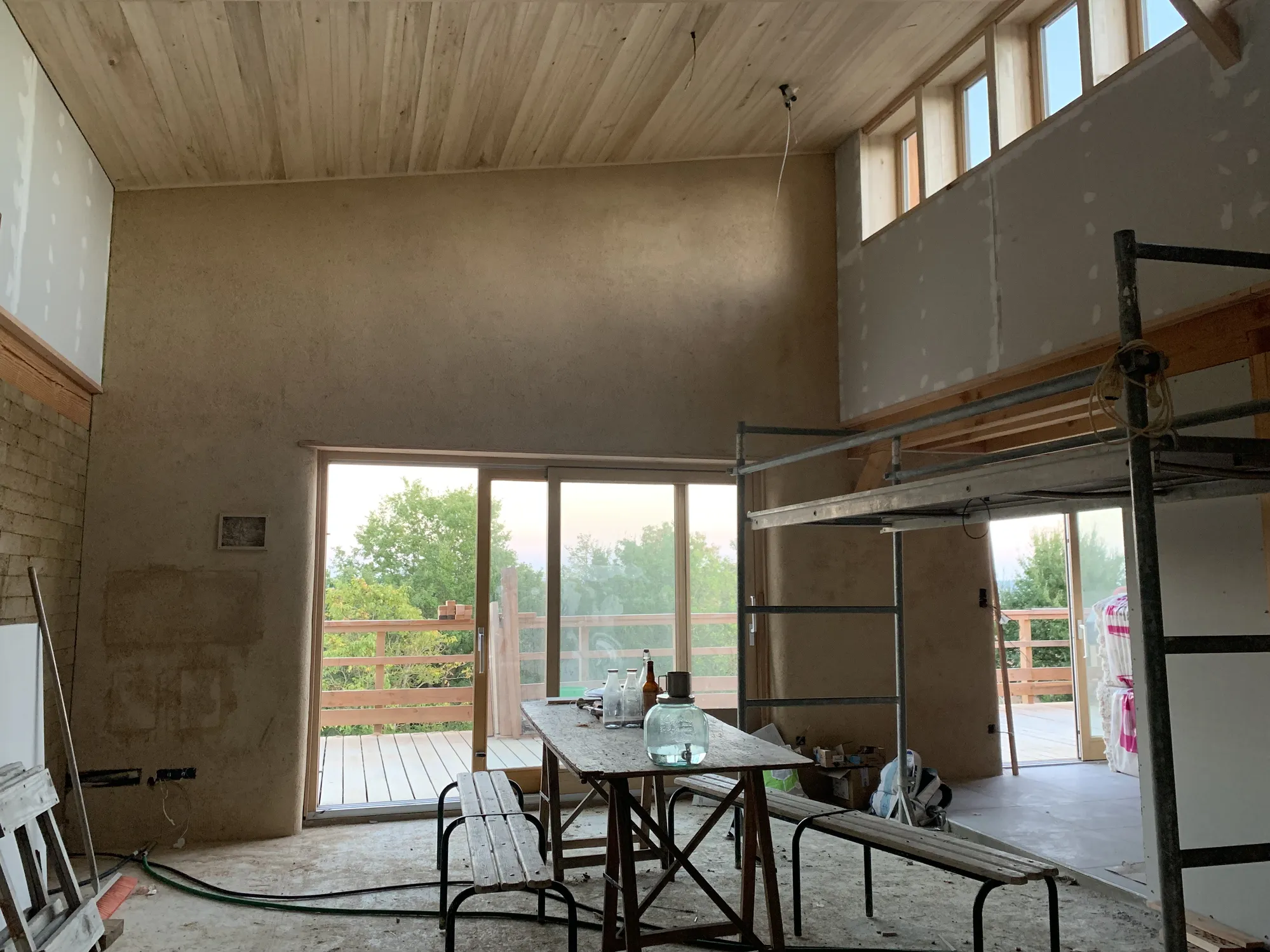 La maison W s’installe dans une pente Est-Ouest. Le plan s’articule autour d’un axe visuel qui traverse la maison du nord au sud, comme un chapelet qui relie toutes les pièces de l’entrée à l’atelier. La maison se tourne à l’Est vers la vallée du Tarn et attrape la lumière du sud par un lanterneau. Elle a été entièrement construite par l’équipe des Bati-frères et coordonné par Grégory Rubio. De la charpente à la menuiserie intérieure, l’équipe démontre la force de leur système constructif pour aboutir d’une maison simple, économe et lumineuse.
